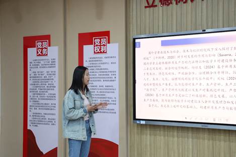 2023级博士研究生孙悦参加了此次论坛,并在分论坛二的活动中作题为《新质生产力赋能数字乡村建设:机理、梗阻与路径》的报告。孙悦在报告中介绍了新质生产力蕴含新要素、新产业、新动能、新形态之“新”的科学内涵,以及具有高科技、高效能、高质量、高阶性之“质”的主要特征。新质生产力与数字乡村建设之间具有深度的逻辑关联,新质生产力通过要素赋能、产业赋能、动力赋能、模式赋能推动数字乡村高质量发展。并介绍了当前数字乡村建设仍然存在技术梗阻、产业梗阻、动力梗阻和模式梗阻,提出应“提升数字技术适配性,发展新质生产力要素;推动乡村产业结构转型升级,培育新业态新模式新产业;改革创新乡村发展方式,形塑内生发展新动能;促进数字逻辑与乡土逻辑贯通融合,实现数字乡村发展新形态”的对应路径。