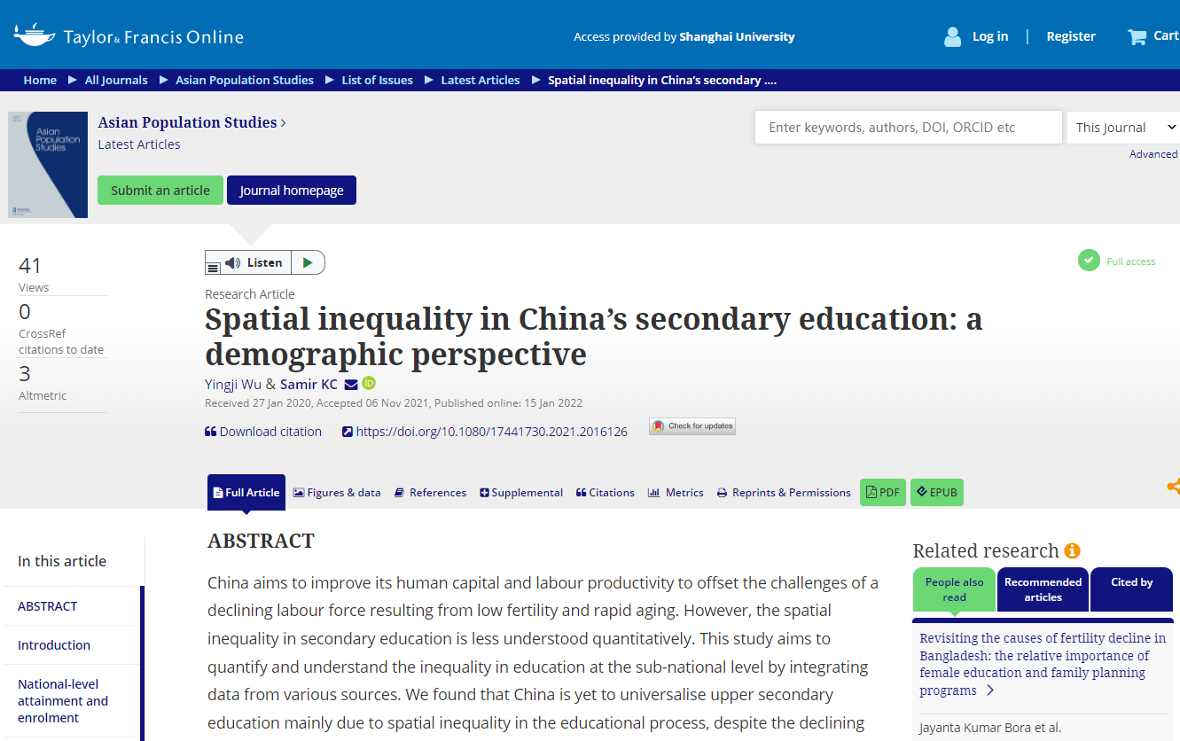 亚洲人口研究中心博士生吴颖机和导师Samir KC在国际SSCI期刊Asian Population Studies发表题为“Spatial inequality in China’s secondary education: a demographic perspective(人口学视角下的中国中等教育的区域不平等)”的文章。