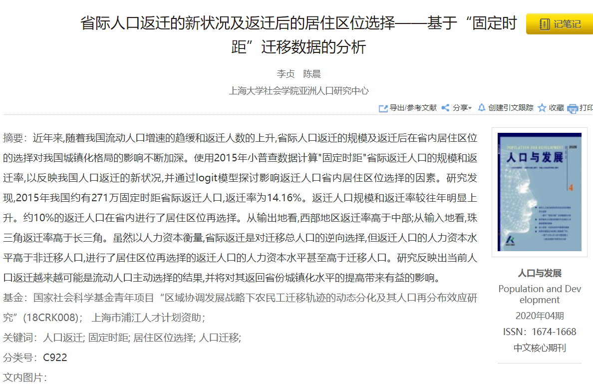李贞等《人口与发展》《省际人口返迁的新状况及返迁后的居住区位选择——基于“固定时距”迁移数据的分析》