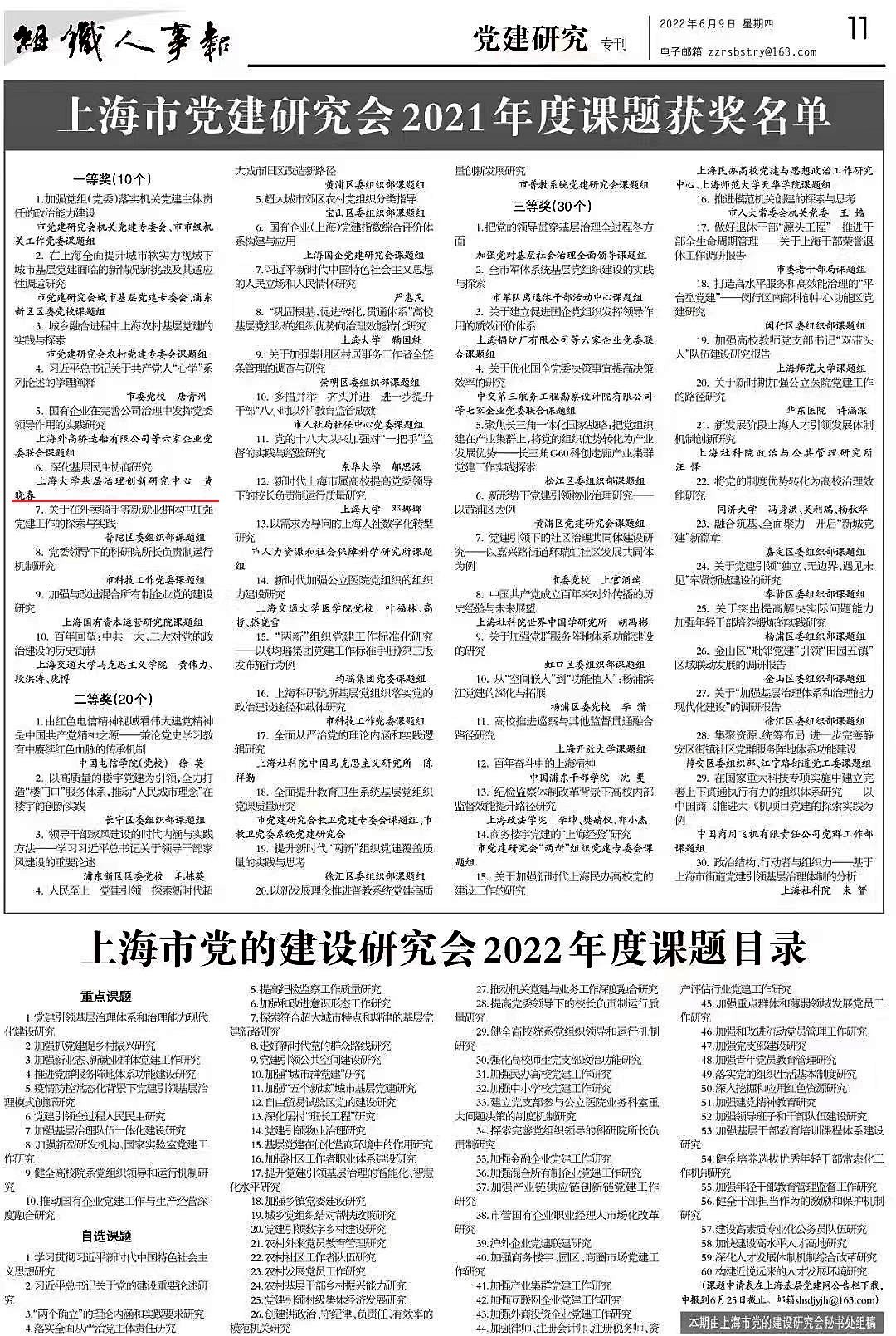 2022年6月9日,《组织人事报》党建研究专刊刊登“上海市党建研究会2021年度课题获奖名单”,我院黄晓春教授的研究课题《深化基层民主协商研究》荣获一等奖。