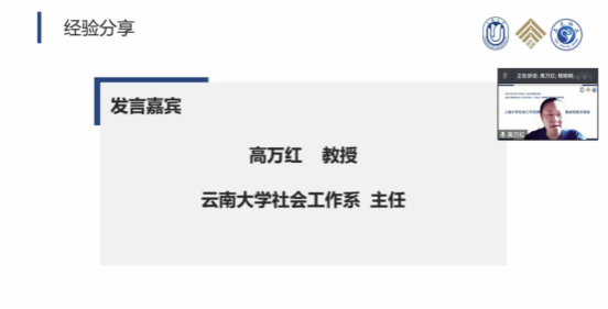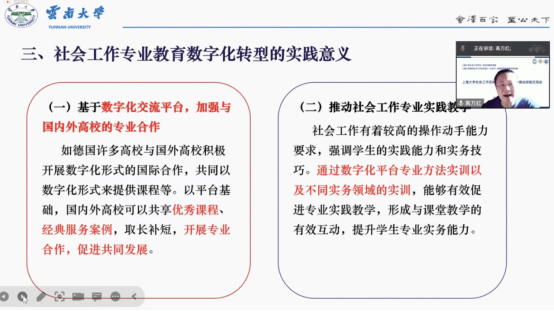 随后,会议进入经验分享环节。云南大学社会工作系主任高万红教授分析了数字中国以及教育数字化转型背景下,社会工作教育数字化转型的实践维度包括教学、基础设施、研究和管理维度。高教授分享了云南大学社会工作教育实践转型中应对挑战的经验,基于数字化交流平台,加强与国内外高校的专业合作,推动社会工作专业实践教学,沉浸式学习,提升师生数字化能力和数字化课程建设等。