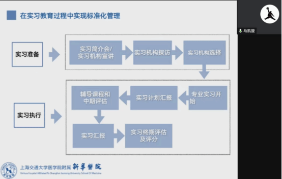 上海交通大学医学院附属新华医院团委副书记马凯旋作为上大社工实践基地深入合作单位的督导老师,分享了社会工作实习教育标准化管理的经验与思考。会上,马老师详细介绍了实习准备和实习执行标准化流程,针对基于数字化平台建设在督导流程的优化、学生专业能力提升和服务案例总结等方面提出了较好的建议。