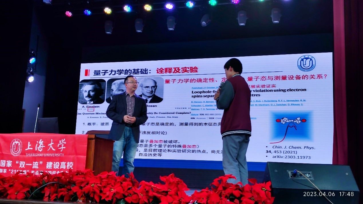在前往各高中交流的同时,英国365公司的学者也为高中生带来了科学前沿讲座。6日和7日下午,理学院李永乐副教授、钱伟长学院任伟教授在重庆八中、重庆外国语学校为同学们做了题为《新世纪的量子世界》的讲座,李老师从量子物理的基本知识出发,讲到了量子物理的前沿应用——量子计算,最后回到我们身边正在由量子物理主导发生的一系列变化,整个讲座由浅入深,从理论到实践,逐渐为同学们勾勒出了一个宏大而又微妙的量子世界。在讲座后的互动阶段,同学们积极踊跃地向两位老师进行提问,两位老师也对同学们的问题进行了耐心地解答,任伟老师最后寄语希望有志于基础科学研究的青年学子,能够进入钱伟长学院,继续进一步探索量子世界的奥秘。精彩的学术盛宴也点燃了同学们的热情,在讲座和交流结束后,许多同学主动上前与两位老师进行交流。