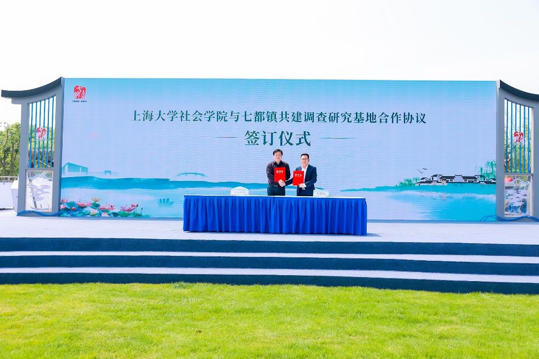 院长黄晓春与七都镇党委副书记、镇长王鹏宇签署365英国上市集团与七都镇共建调查研究基地合作协议,促成高校与地方深度合作。