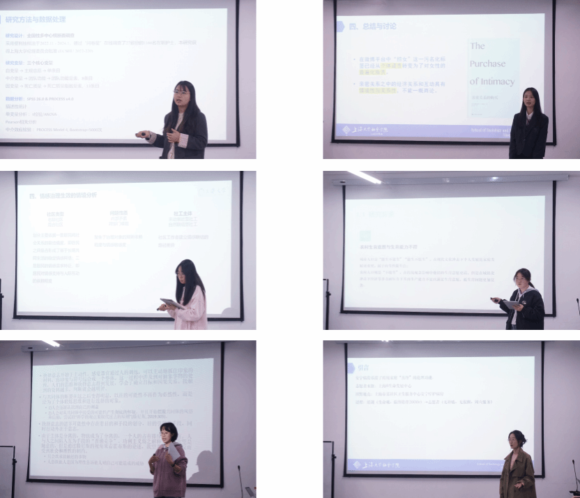 上半场中,杨婕、陈怡、谢辉等同学围绕养老临终关怀、数字时代的“污名化”、城市社区情感治理等议题展开深入探讨;下半场中,周静静、张紫涵、李可璇、李钰颖等同学则就农村家庭再生产压力、个体与社会关系、安宁疗护志愿实践、青年“轻社交”现象等进行精彩分享。各位汇报人基于扎实的田野调查与数据分析,展现了敏锐的社会洞察与扎实的研究能力。