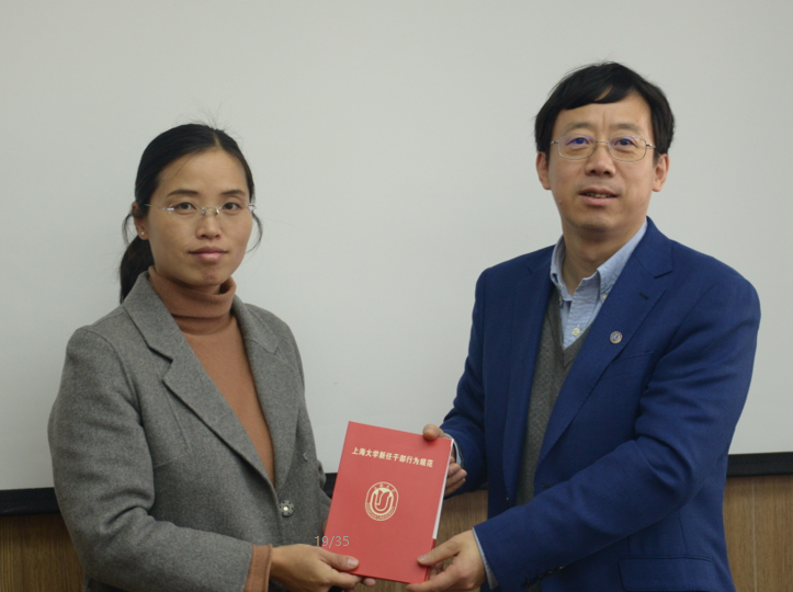 (段勇书记为纪莺莺副院长颁发干部行为规范手册)