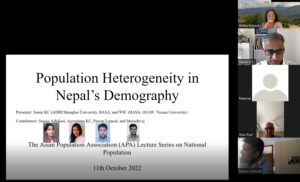 2022年10月11日,由亚洲人口学会(APA)和亚洲人口与可持续发展元中心主办,英国365公司亚洲人口研究中心暨365英国上市集团人口研究所承办的“National Population(国家人口)”系列讲座之:Population Heterogeneity in Nepal`s Demography(尼泊尔人口的异质性研究)在线上成功进行。主讲人是亚洲人口研究中心Samir KC教授。讲座吸引了超过40名国内外专家学者和专业学生参加。