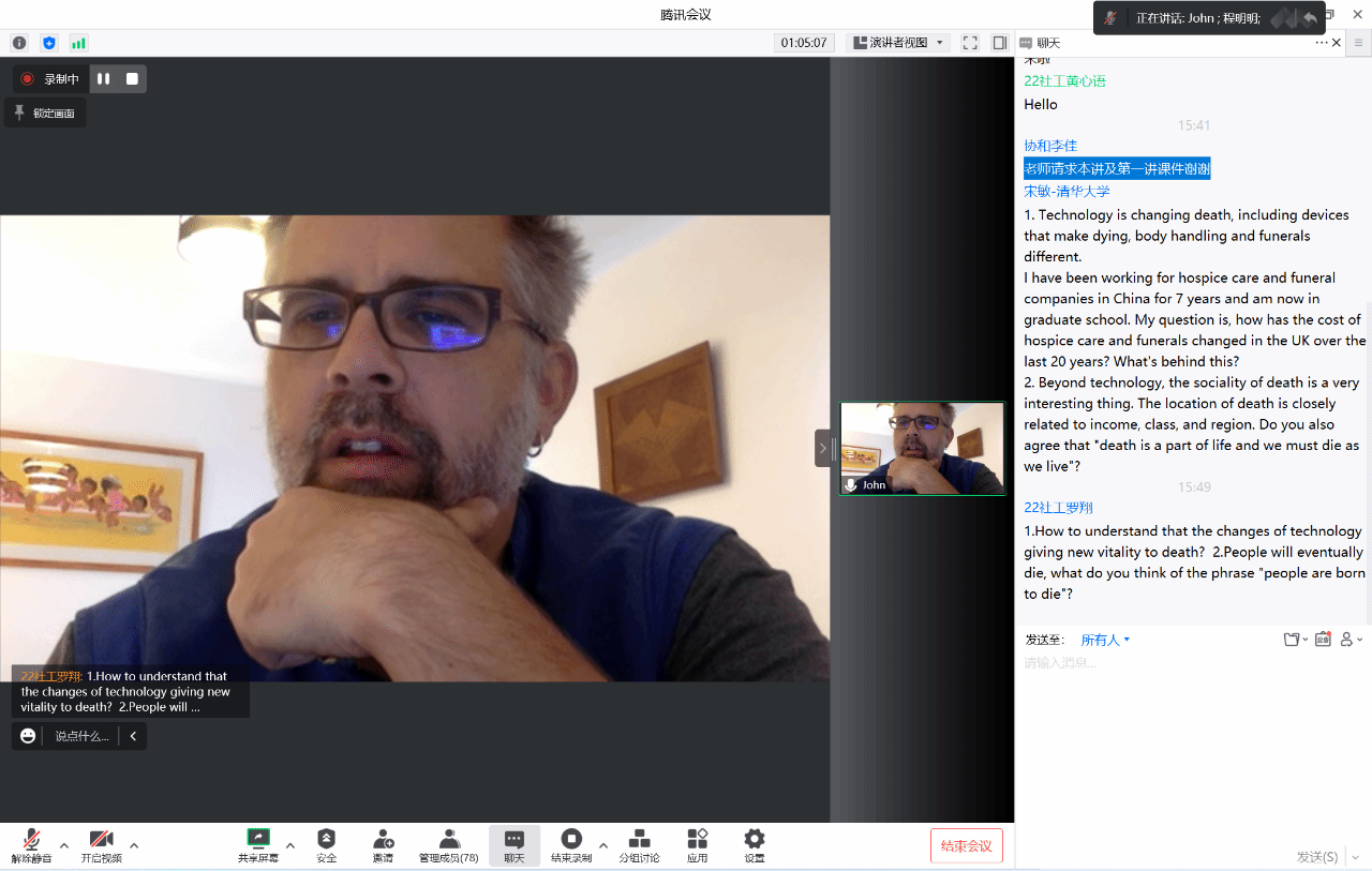 系列讲座聚焦于“健康照顾领域中的人文服务与社会政策”主题,围绕英国健康照护体系、健康政策、社会工作服务、安宁疗护与死亡等议题展开。讲座内容涵盖从健康照顾的政策到临床实务,由英国巴斯大学社会和政策科学系John Troyer教授团队主讲,分别是英国巴斯大学社会和政策科学系副教授John Troyer、英国巴斯大学社会工作高级讲师Jeremy Dixon、英国大学学院教育研究所研究员方超、英国巴斯大学社会与政策科学系在读博士郭晨阳分别讲述。讲述主题分别是:英国健康照顾体系概况、英国健康照顾领域的社会政策概述、数字化死亡的未来趋势、英国健康社会工作的发展与挑战、英国安宁疗护社会工作的进展与相关政策以及英国安宁疗护的发展与困境。