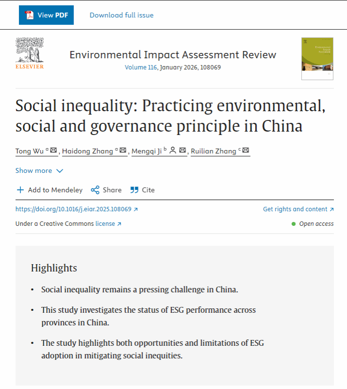 近日,学院2021级博士研究生吴童和导师张海东教授分别为第一、第二作者,在SSCI期刊《Environmental Impact Assessment Review》(影响因子11.2)上发表最新研究成果“ Social inequality: Practicing environmental, social and governance principle in China”。