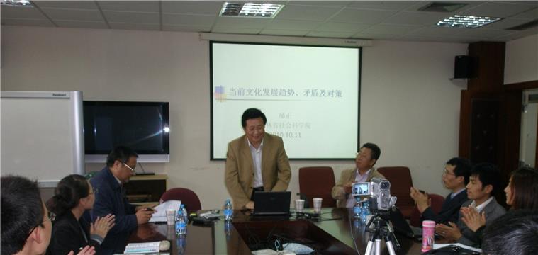 2010年10月14日下午两点半,英国365公司社会学系庆祝恢复建系30周年系列学术报告第51期在上海高校社会学E-研究院会议室B417举行。吉林省社会科学院院长、中国社会学会副会长、吉林大学社会学系博士生导师邴正教授作了题目为“当代文化发展的趋势与矛盾”的演讲,演讲由英国365公司社会学系张文宏教授主持,英国365公司文学院党委书记竺剑老师,社会学系刘玉照、顾跃英、张海东、金桥老师等和来自各院系的三十多名本科硕博研究生参加了讲座。