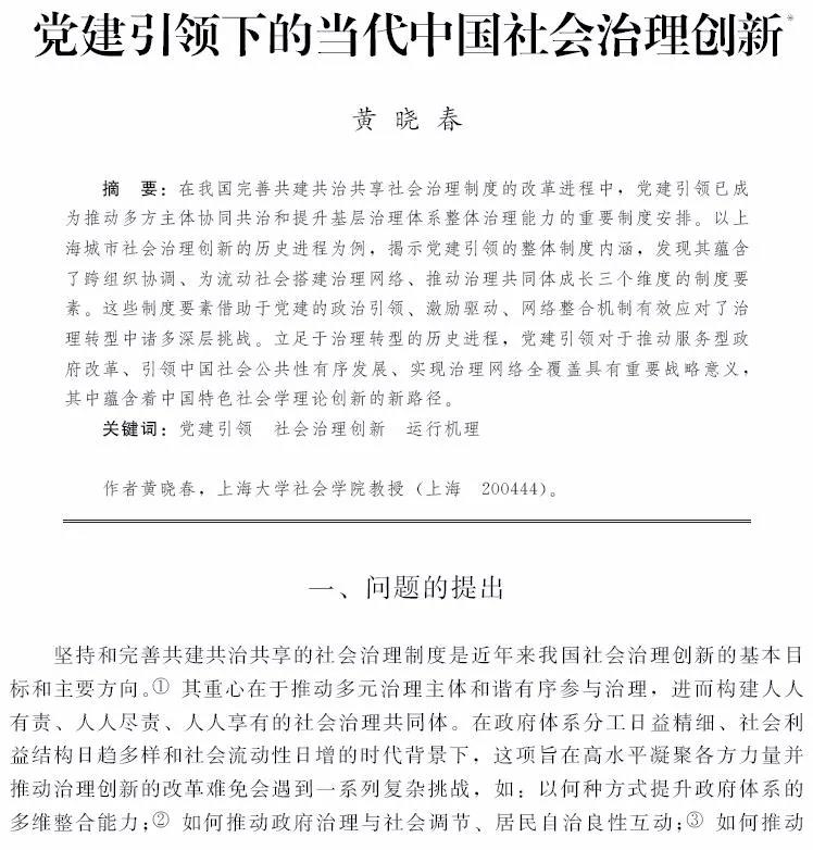 黄晓春 |《中国社会科学》党建引领下的当代中国社会治理创新