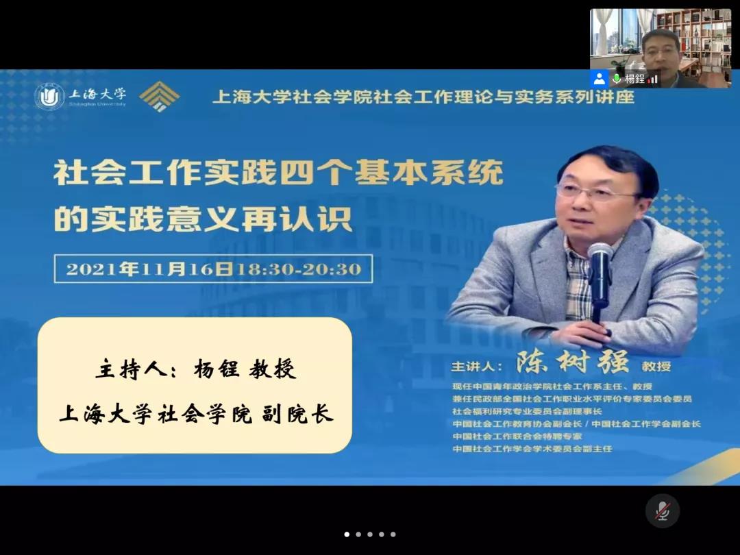 2021年11月16日晚,社会工作理论与实务系列讲座——“社会工作实践四个基本系统的实践意义再认识”在腾讯会议顺利举行。本次讲座诚邀中国青年政治学院社会工作系主任陈树强教授主讲,由杨锃副院长主持,来自全国各地的高校师生、社会工作者、社区工作者等三百余人线上参与学习和探讨。