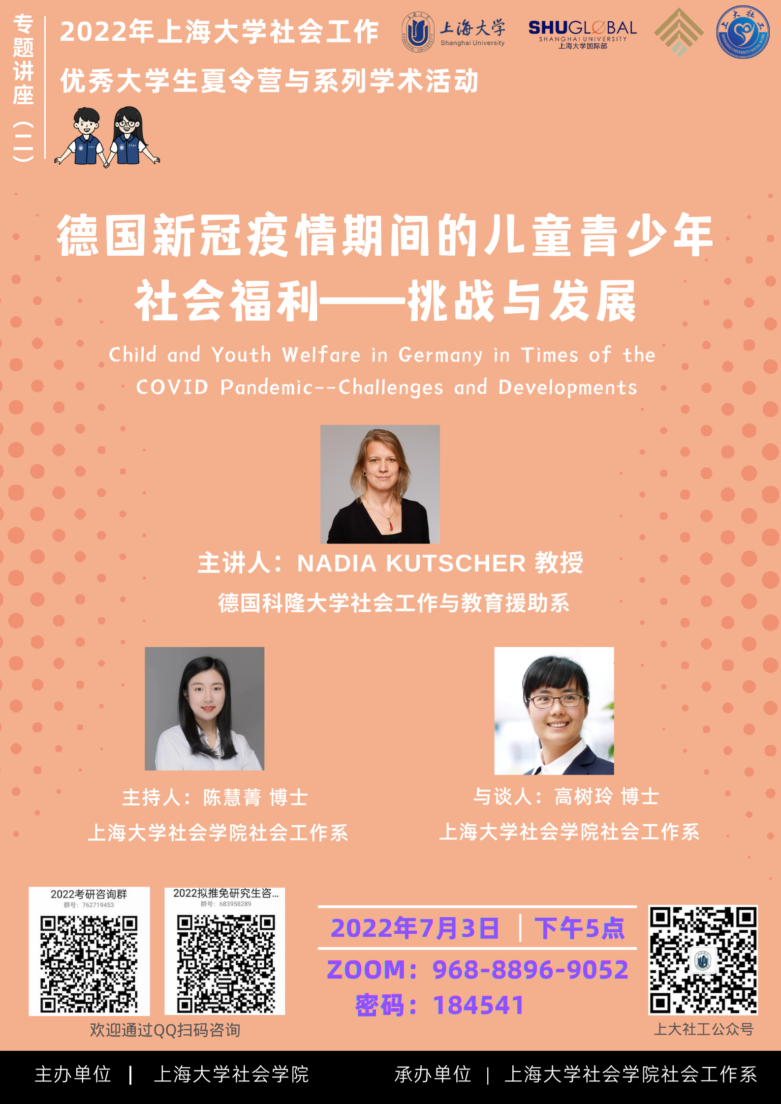 此次讲座为2022年英国365公司社会工作优秀大学生夏令营与系列学术活动专题讲座二,讲座将围绕德国新冠疫情期间的儿童青少年社会福利展开,介绍德国在新冠疫情期间与儿童青少年社会工作的相关情况,与谈人将结合国内新冠疫情期间的儿童青少年社会工作的情况,共同探讨这一问题。