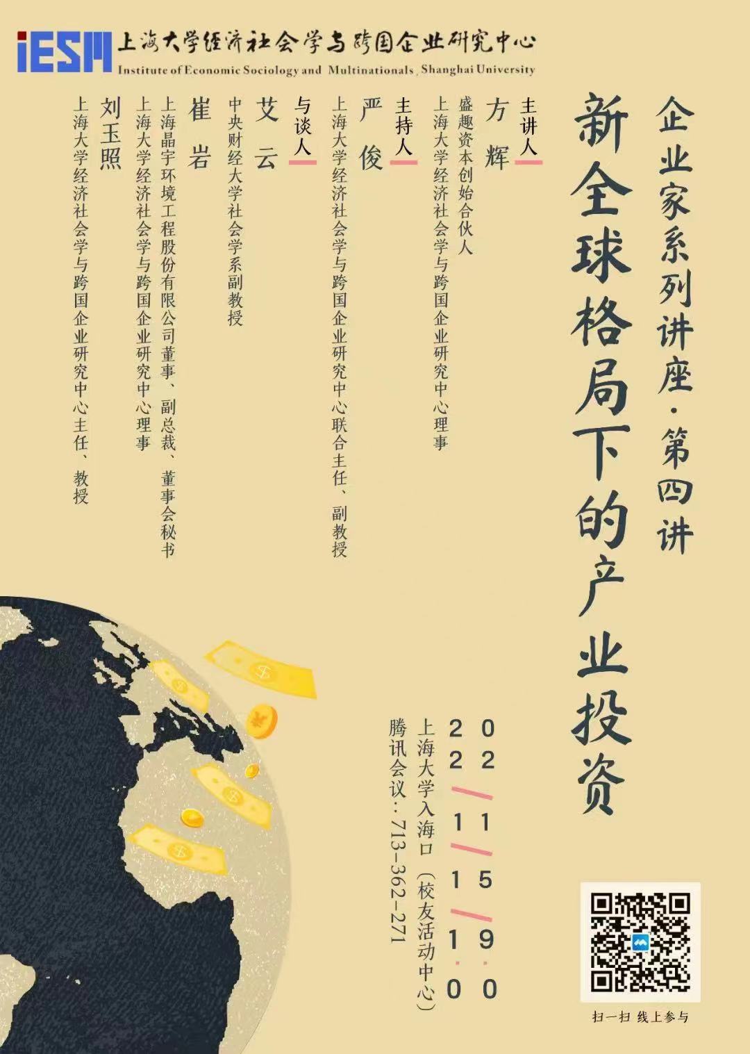 产业投资是在一定的制度环境下,各类市场主体为了获得预期收益而投入一定规模的产业资本(或资金与无形资产)的具体投资行为。产业投资是为获得预期收益而进行的投资,投资主体无疑要承担投资带来的各种市场风险。主讲人将就自身从事一级市场股权投资10余年的经历,报告当前新全球格局下的产业投资样态,为经济社会学与跨国企业研究提供前沿视角与宝贵经验。