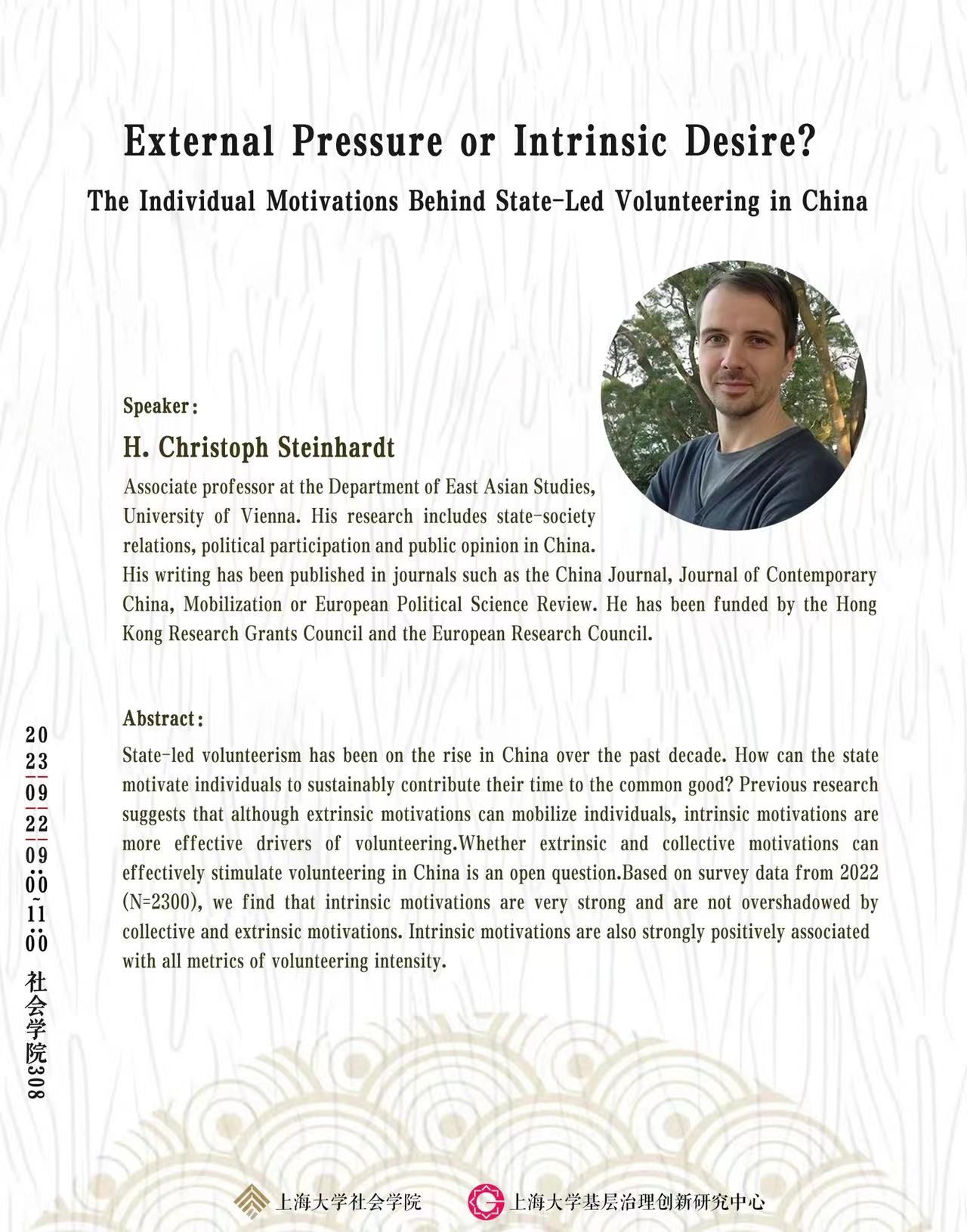 主讲人:H. Christoph Steinhardt is associate professor at the Department of East Asian Studies, University of Vienna. His research includes state-society relations, political participation and public opinion in China. His writing has been published in journals such as the China Journal, Journal of Contemporary China, Mobilization or European Political Science Review. He has been funded by the Hong Kong Research Grants Council and the European Research Council.