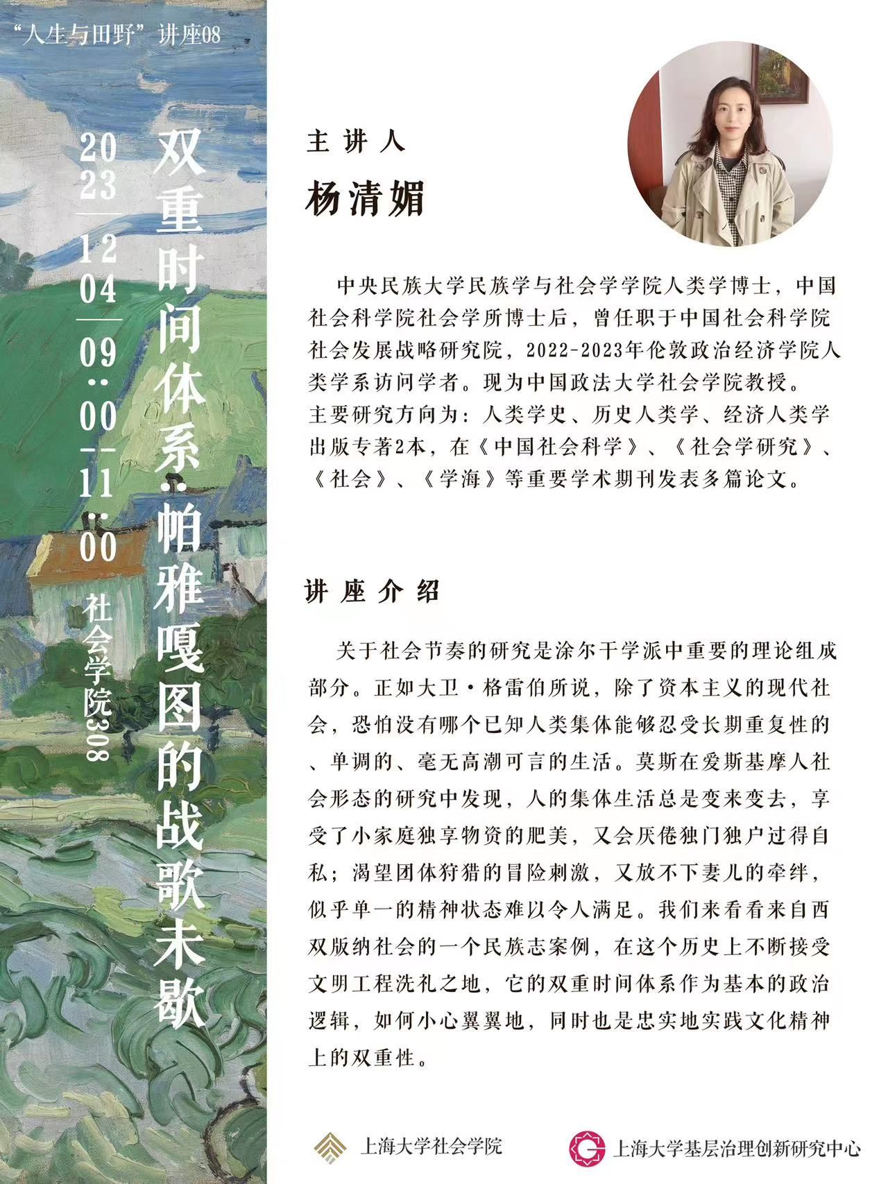 主讲人杨清媚,中央民族大学民族学与社会学学院人类学博士,中国社会科学院社会学所博士后,曾任职于中国社会科学院社会发展战略研究院,2022-2023年伦敦政治经济学院人类学系访问学者。现为中国政法大学365英国上市集团教授。主要研究方向为:人类学史、历史人类学、经济人类学出版专著2本,在《中国社会科学》《社会学研究》《社会》《学海》等重要学术期刊发表多篇论文。