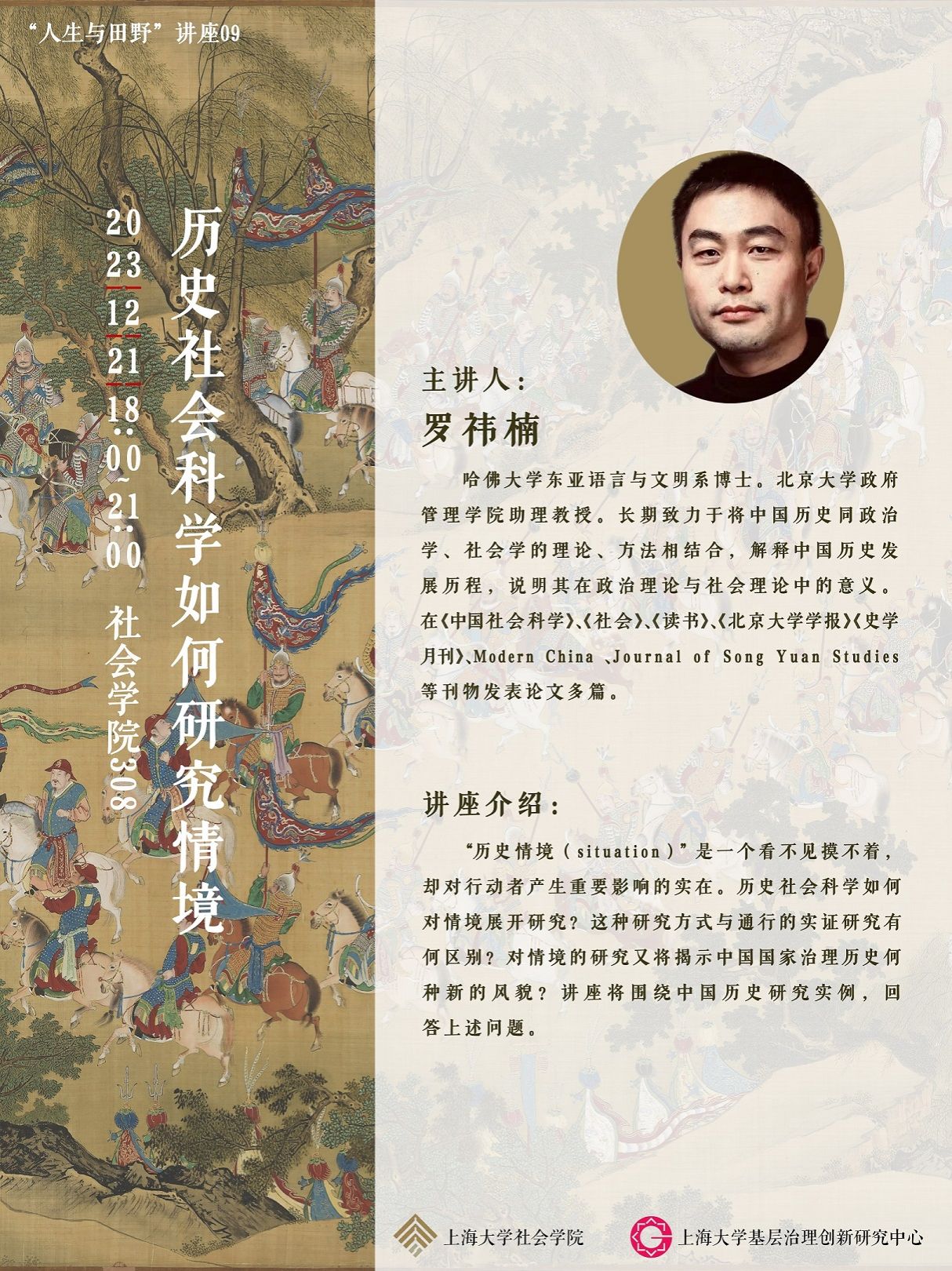 主讲人:罗袆楠,哈佛大学东亚语言与文明系博士。北京大学政府管理学院助理教授。长期致力于将中国历史同政治学、社会学的理论、方法相结合,解释中国历史发展历程,说明其在政治理论与社会理论中的意义。在《中国社会科学》《社会》《读书》《北京大学学报》《史学月刊》、Modern China、 Journal of Song Yuan Studies等刊物发表论文多篇。