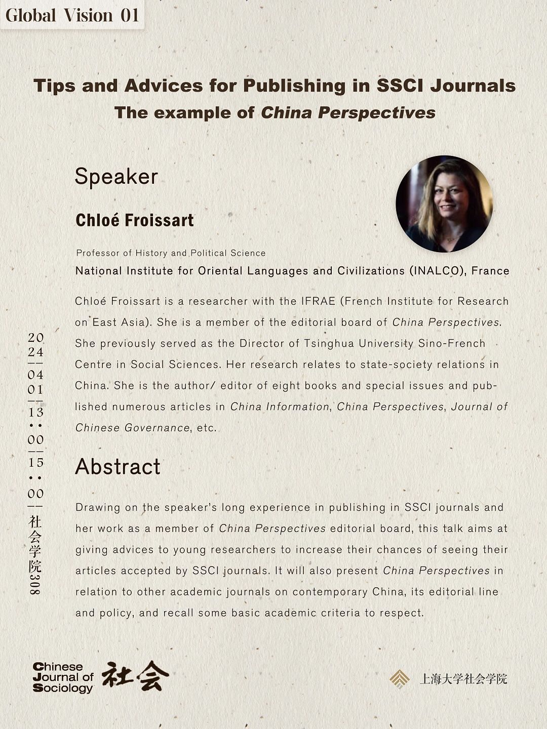 内容简介:Drawing on the speaker's long experience in publishing in SSCl journals and her work as a member of China Perspectives editorial board, this talk aims at giving advices to young researchers to increase their chances of seeing their articles accepted by SSCl journals. lt will also present China Perspectives in relation to other academic journals on contemporary China, its editorial line and policy, and recall some basic academic criteria to respect.