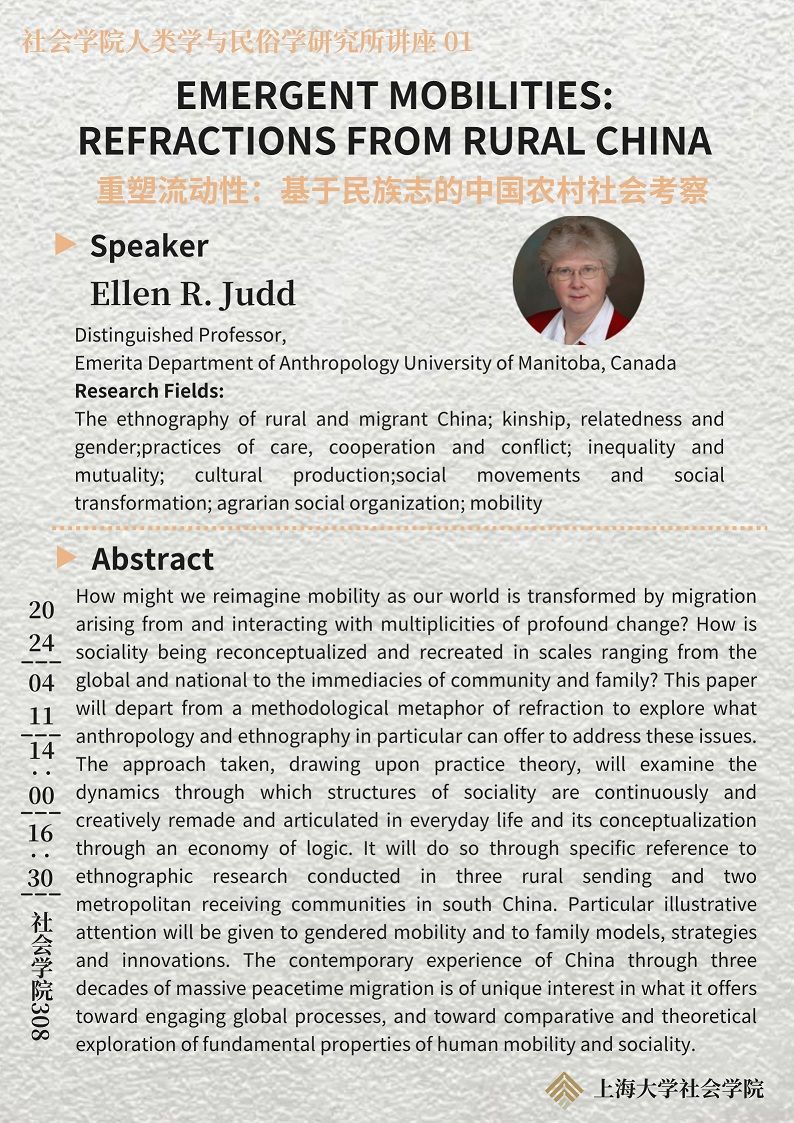 主讲人:Ellen R. Judd, Distinguished Professor, Emerita Department of Anthropology University of Manitoba, Canada. Research Fields: The ethnography of rural and migrant China; kinship, relatedness and gender; practices of care, cooperation and conflict; inequality and mutuality; cultural production; social movements and transformation; agrarian social organization; mobility.