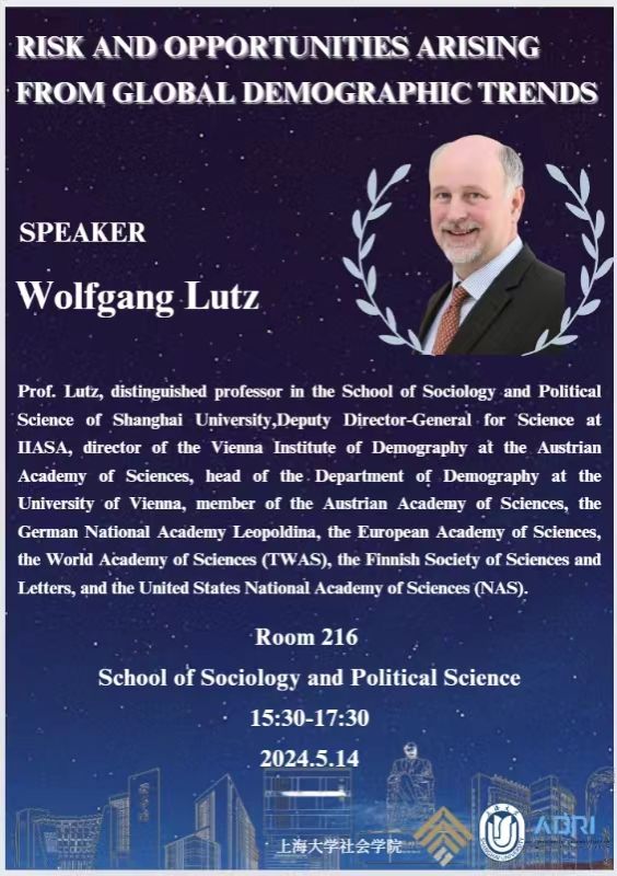 主讲人:Prof. Wolfgang Lutz,distinguished professor in the School of Sociology and Political Science of Shanghai University, Deputy Director-General for Science at IIASA, director of the Vienna Institute of Demography at the Austrian Academy of Sciences, head of the Department of Demography at the University of Vienna, member of the Austrian Academy of Sciences, the German National Academy Leopoldina, the European Academy of Sciences, the World Academy of Sciences (TWAS), the Finnish Society of Sciences and Letters, and the United States National Academy of Sciences (NAS).