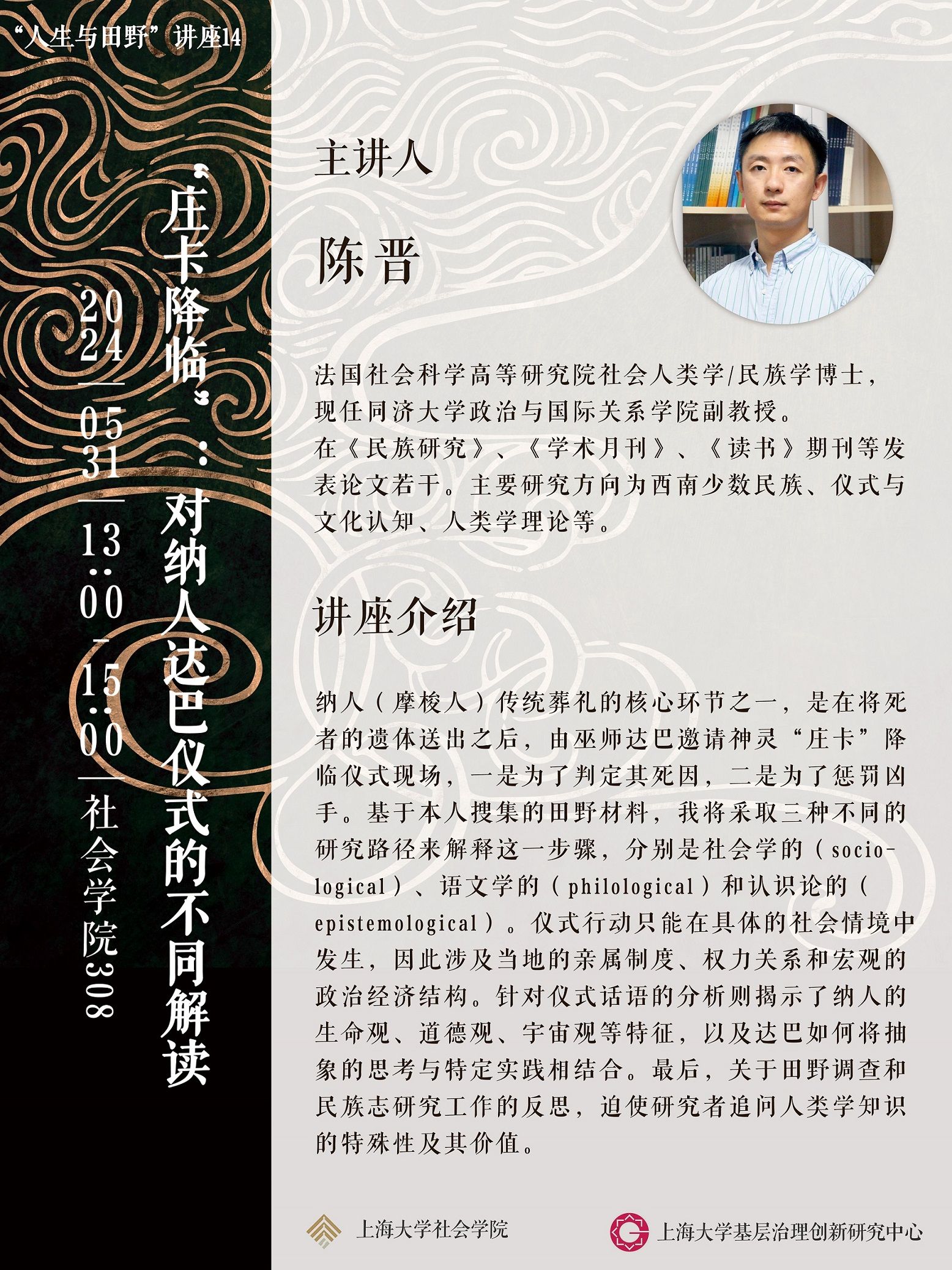 主讲人:陈晋,法国社会科学高等研究院社会人类学/民族学博士,现任同济大学政治与国际关系学院副教授。在《民族研究》、《学术月刊》、《读书》期刊等发表论文若干。主要研究方向为西南少数民族、仪式与文化认知、人类学理论等。