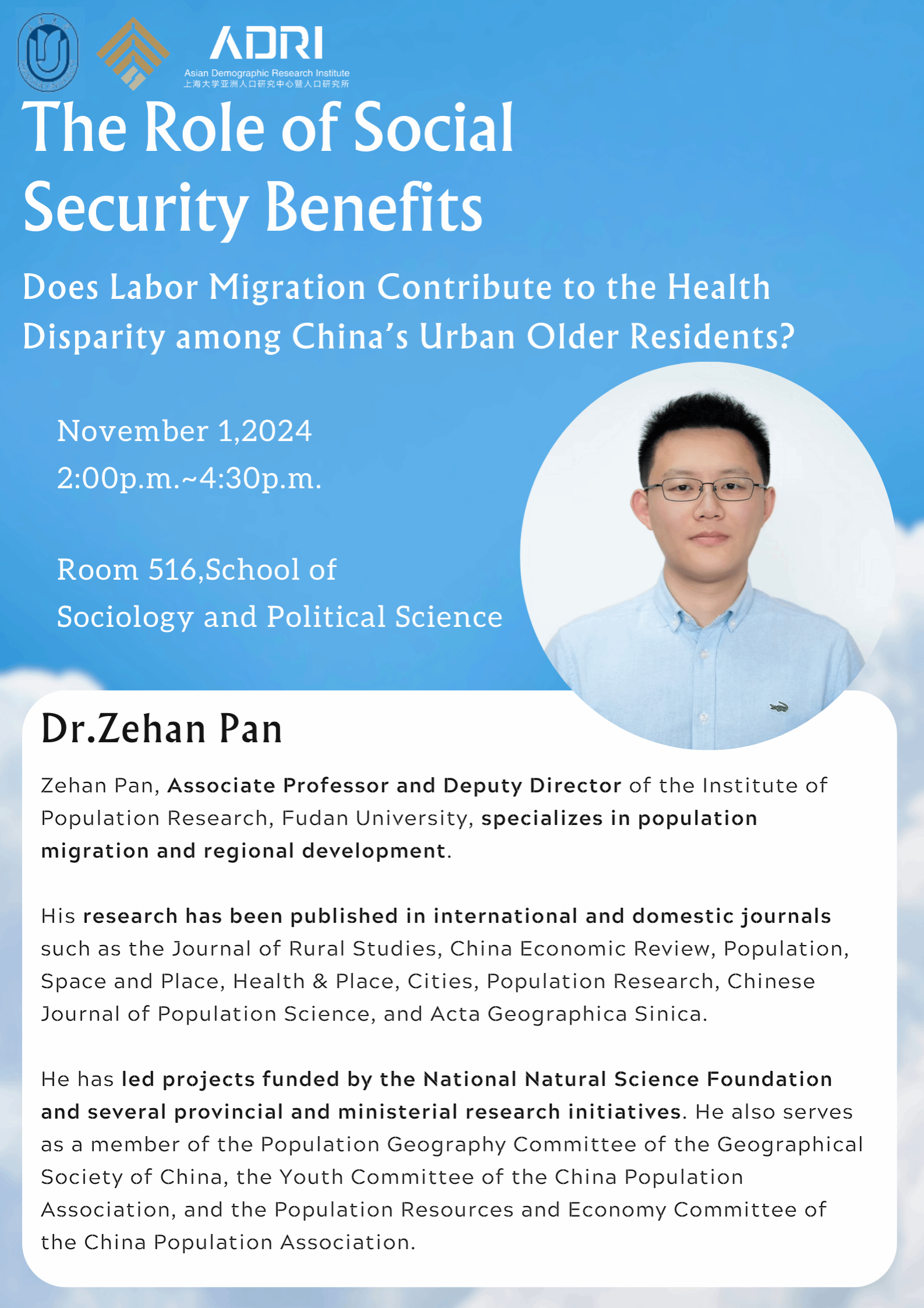 主讲人:潘泽瀚,复旦大学人口研究所副教授、副所长,主要研究方向为人口迁移与区域发展。其研究成果发表于《乡村研究》、《中国经济评论》、《人口、空间与地点》、《健康与地点》、《城市》、《人口研究》、《中国人口科学杂志》、《地理学报》等国内外期刊。主持国家自然科学基金项目和多项省部级科研项目。兼任中国地理学会人口地理专业委员会委员、中国人口学会青年委员会委员、中国人口学会人口资源与经济专业委员会委员。