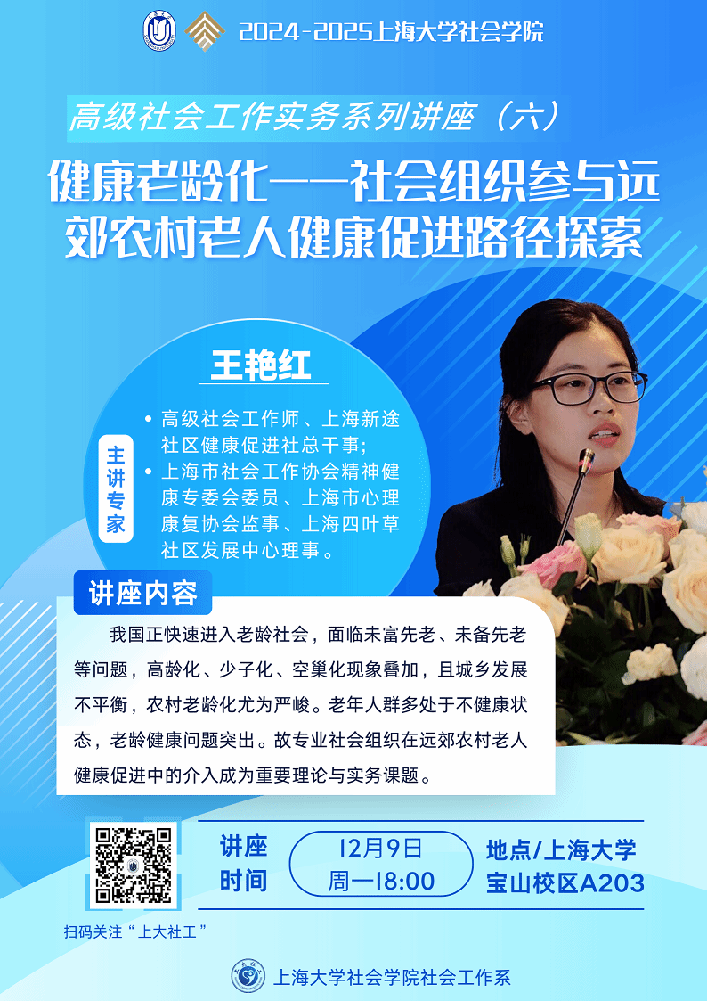 主讲人:王艳红,高级社会工作师,上海新途社区健康促进社总干事;担任多所高校社会工作专业硕士实务督导;任上海市社会工作协会精神健康专委会委员、上海市心理康复协会监事、上海浦东新区社会工作协会理事、上海四叶草社区发展中心理事、上海融融社区发展中心理事。