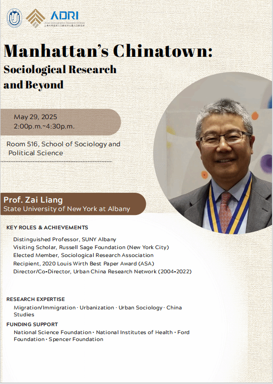 主讲人:梁在,纽约州立大学的杰出教授兼社会学系主任,曾是纽约市罗素・塞奇基金会的访问学者。他是社会学研究协会的当选会员,并荣获 2020 年美国社会学协会路易斯・沃思最佳论文奖。梁博士的研究得到了许多基金会的支持,包括美国国家科学基金会、美国国立卫生研究院、福特基金会和斯宾塞基金会等。在 2004 年至 2022 年期间,他担任设在奥尔巴尼的中国城市研究网络的主任和联合主任。他的主要研究兴趣包括人口迁移 / 移民、城市化、城市社会学以及中国研究。