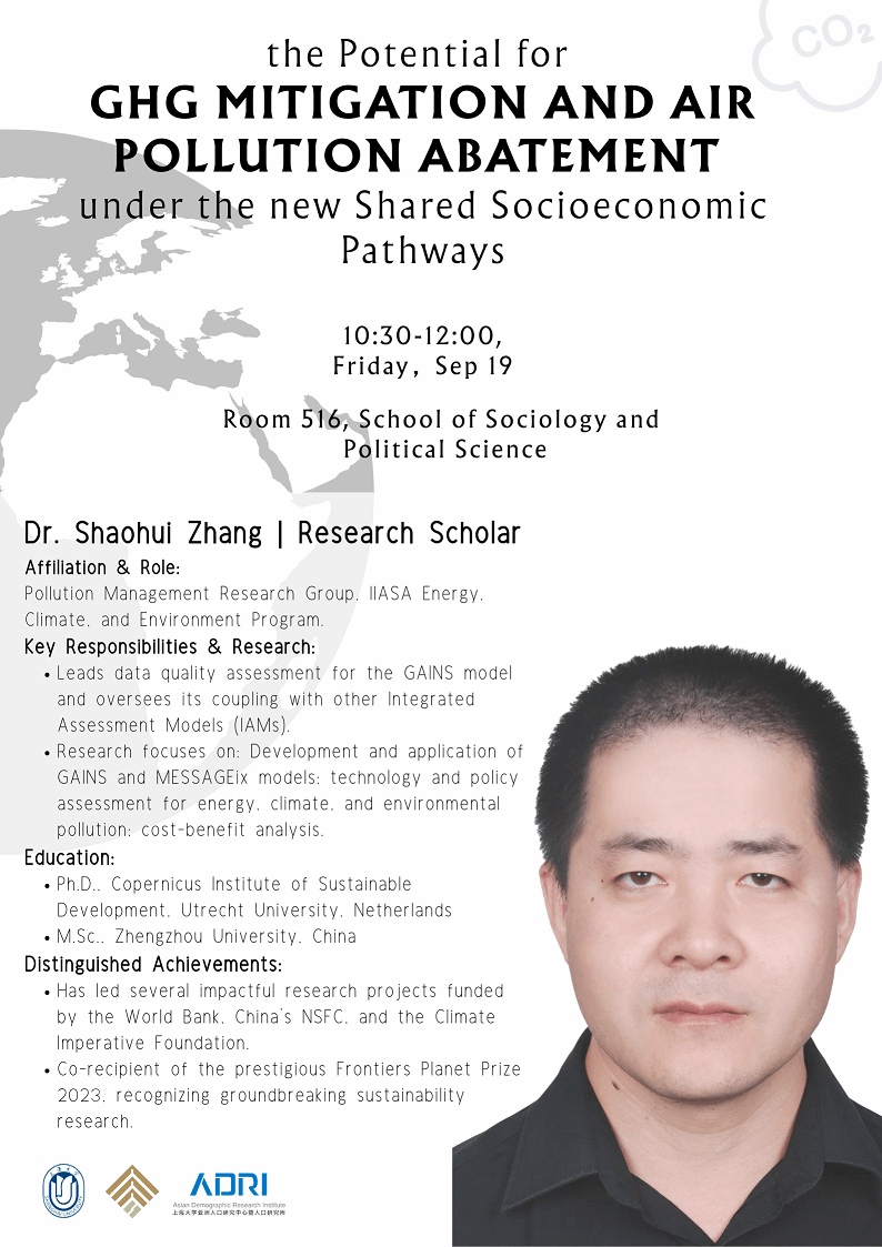 主讲人:张少辉博士,现任国际应用系统分析研究所(IIASA)能源、气候与环境计划污染管理研究组的研究学者。他主要负责领导协调GAINS模型数据质量评估工作,并监督GAINS与其他综合评估模型(IAMs)的耦合开发。他的研究聚焦于GAINS与MESSAGEix综合评估模型的开发应用、能源气候与环境污染的技术政策评估以及成本效益分析。他先后毕业于中国郑州大学(硕士学位)与荷兰乌得勒支大学哥白尼可持续发展研究所(博士学位),曾主持世界银行、国家自然科学基金委员会(NSFC)及Climate Imperative基金会资助的多个具有重要影响的研究项目,其研究成果曾获2023年“前沿地球奖”(Frontiers Planet Prize)等国际奖项。