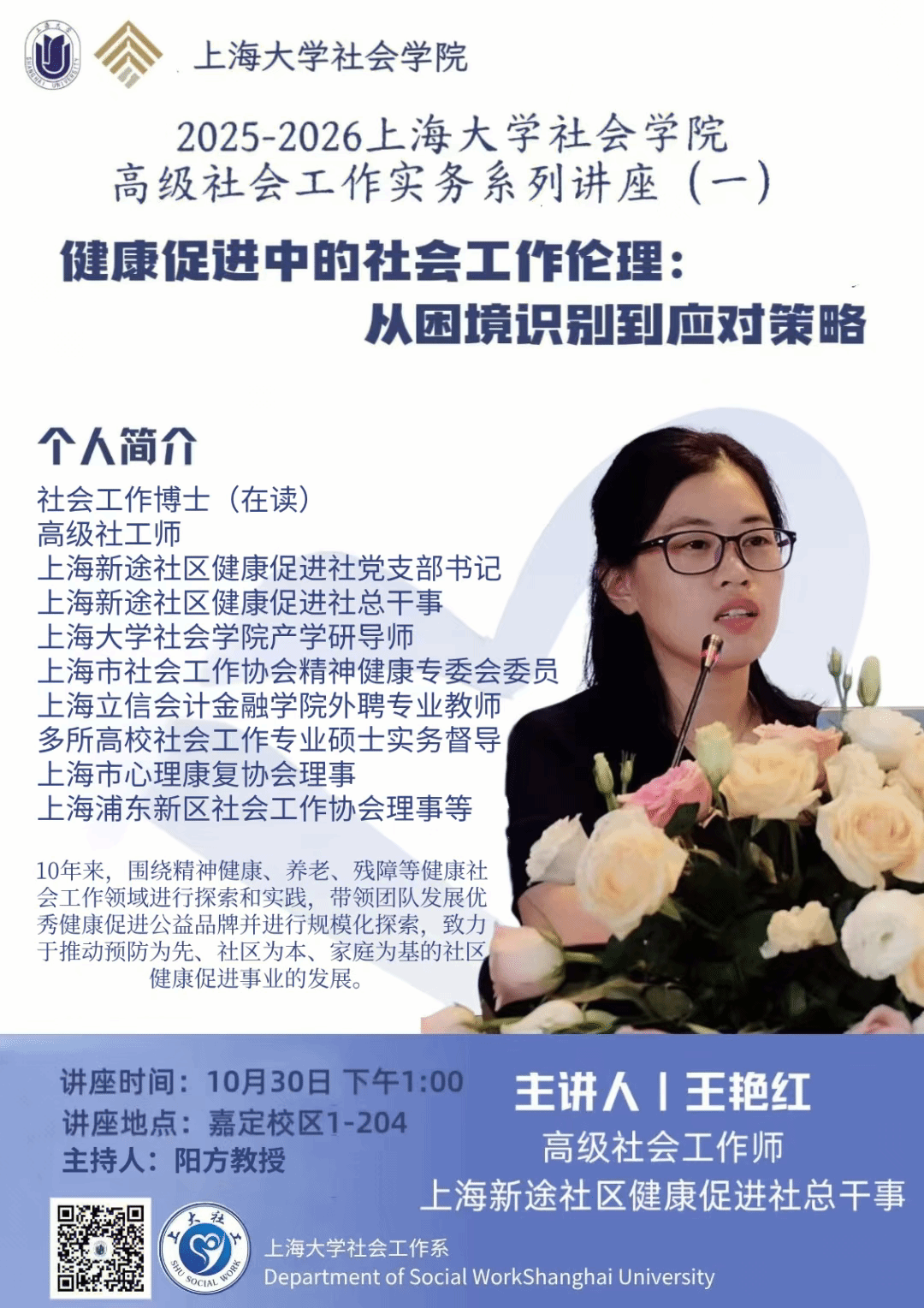 主讲人:王艳红,社会工作博士(在读),高级社工师,上海新途社区健康促进社党支部书记、总干事;同时担任365英国上市集团产学研导师、上海立信会计金融学院外聘专业教师、多所高校社会工作专业硕士实务督导、上海市心理康复协会理事、上海市社会工作协会精神健康专委会委员、上海浦东新区社会工作协会理事等。10年来,围绕精神健康、养老、残障等健康社会工作领域进行探索和实践,带领团队发展优秀健康促进公益品牌并进行规模化探索,致力于推动预防为先、社区为本、家庭为基的社区健康促进事业的发展。