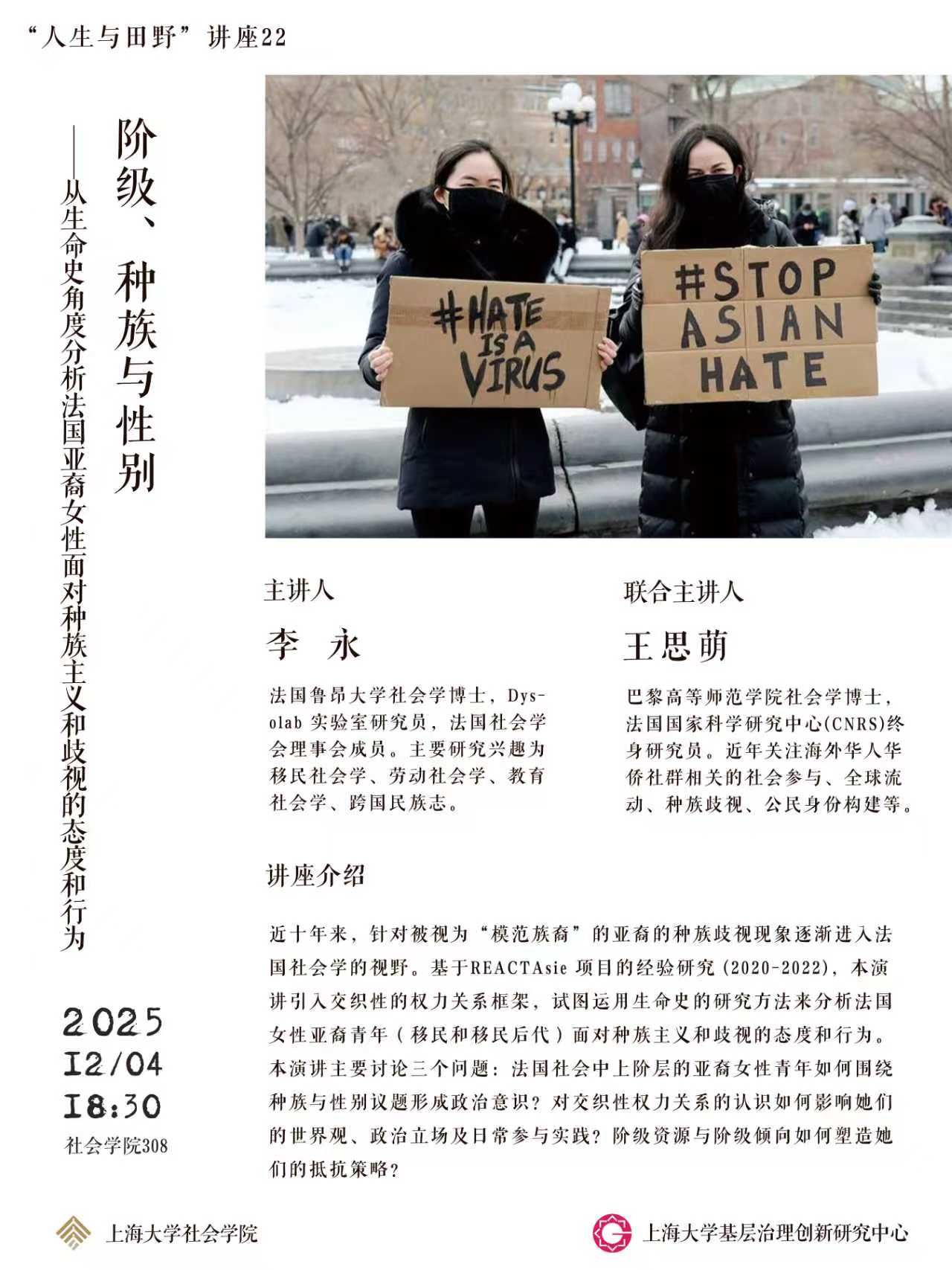 联合主讲人:王思萌,巴黎高等师范学院社会学博士,法国国家科学研究中心(CNRS)终身研究员。她的研究领域涉及海外华人华侨,亚裔移民,全球健康,跨国流动。她的学术发表包括Chinese Migrants in Paris. The Narratives of Illusion and Suffering(Brill,2021),Handbook of Chinese Migration to Europe (Brill, 2024)等,并主持多项科研课题。王思萌近年尤其专注与海外华人华侨社群相关的社会参与、全球流动、种族歧视、公民身份构建等课题的研究。
