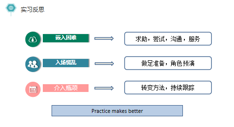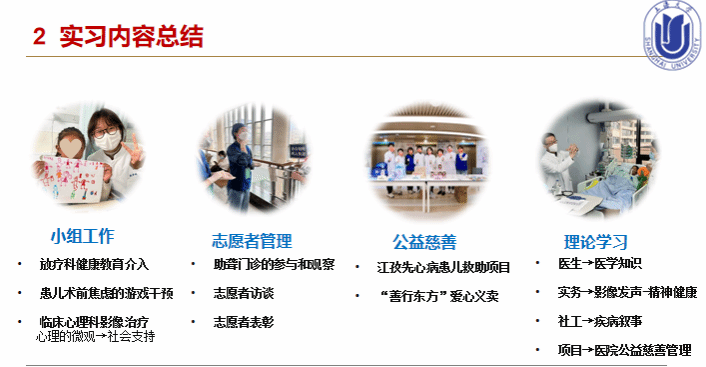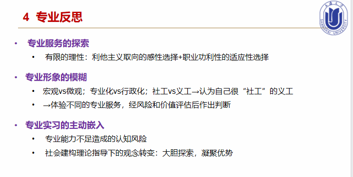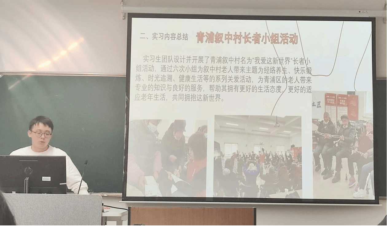 在汇报阶段,社工学生通过PPT和视频展示,从实习单位介绍、实习内容、实习收获和实习反思等多个方面进行了总结与分享。2022级55位MSW同学第一阶段实习领域涵盖了儿童青少年社会工作、老年社会工作、医务社会工作、社会治理等多个领域,服务对象包括困境儿童、残障人士、老年人、病患及家属等群体,实习内容主要有社区入户探访、个案服务、小组活动、各类主题活动等方面。在实习收获和反思方面,同学们纷纷表示,实习既是对理论的实践,也是对专业认同的强化。在提供专业服务时,既要反思相关社工伦理问题,又要提高专业服务技巧,还要思考国家的相关政策,实现社会福利和社会公正。