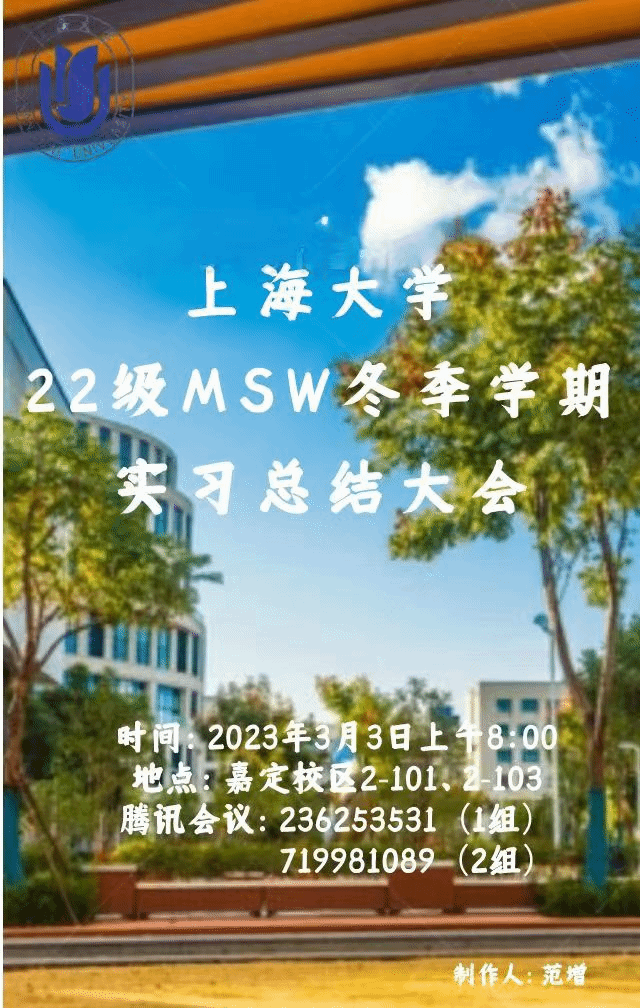 3月3日,社会工作系在嘉定校区第二教学楼举办了2022级MSW实习总结大会。55位2022级MSW同学参会,分两组同步进行,程明明系主任和阳方系副主任线上参会,会议分别由陈彩霞老师和程金老师主持。