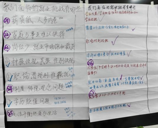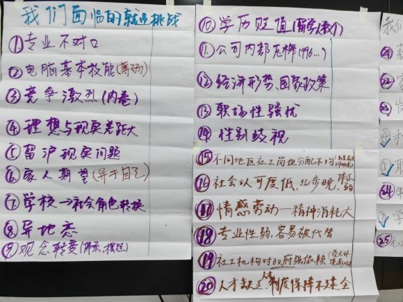 以“我们面临的就业挑战有哪些?”为主题,大家学习了“头脑风暴”工具。学习中各抒己见,踊跃发言,发挥集体智慧,分别从能力状况、性别歧视、内卷状态、就业观念、就业期待、经济形势与国家政策、社会角色的转变适应等角度予以思考,采取点投法选出最认可的几点挑战,也使同学们明白了头脑风暴需经历发散和收敛的过程。