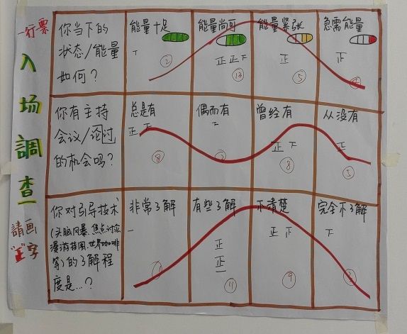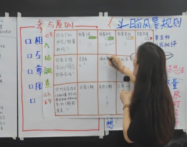 以理论知识+互动交流的方式,从“引导的概念、引导的工具、集体思维开拓的流程”三个层面进行专业讲解。同学们逐步了解了“引导”、“引导者”、“引导者信念”、“引导工具”、“引导的收益和功效”等专业概念。刘老师指出引导式会议会用与需求采集、行动计划、可行性探讨、利益相关方对话、差距分析、愿景现状等实际场景。在入场时,刘老师让到场的各位同学一次填写了入场调查表,从“你当下的状态/能量如何?”“你有主持会议/讨论的机会吗?”“你对引导技术(头脑风暴、焦点讨论、漫游挂图、世界咖啡等)的方式了解程度?”为主题进行入场调查,并对结果进行了分析。