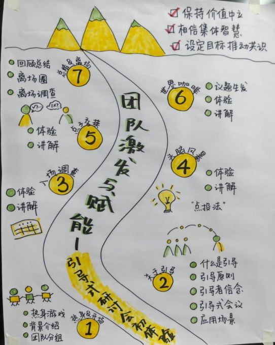 培训分为热身开场、关于引导的讲解、入场调查、头脑风暴、点子交换、世界咖啡馆、总结立场七大部分。全场保持价值中立、相信集体智慧、设定目标推动共识。