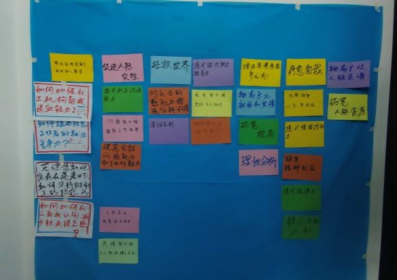 以“社会工作可以为我们就业形势带来哪些优势?”为题进行点子交换。首先是个人头脑风暴;其次是3人小组交流,互相“偷”点子;最后是小组内整理。“世界咖啡馆”是近年来国际上广泛运用的团队学习方法,是一种集体提出问题、分享观念的方法。通过创造一个像咖啡馆般让人觉得舒适的空间,运用分组讨论、交互轮替的方式,让人们去交流讨论与他们有关的事情并集体寻找智慧,让多元丰富的观点与意见得到最大激荡,让集体智慧油然而生。在头脑风暴和点子交换的基础上进行了议题生发,同学们根据想和现场小伙伴尝试探讨来解决的议题的前提,最终产生了“如何应对生活中对女性的性别歧视问题?”“回家乡就业给我们带来的利与弊?”“社工专业学生就业去向?”“如何提高社会对社会工作专业的了解?”四个开放式议题。同学们围绕四个议题展开了激烈的讨论,形成了集体共识。