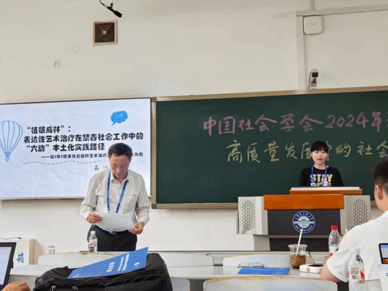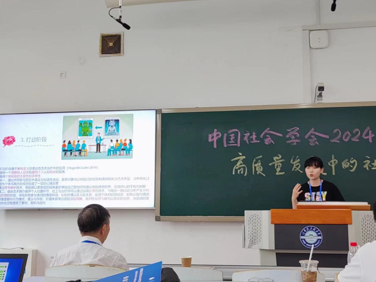 2024年7月6日,我院2021级博士研究生张芯桐,于哈尔滨工程大学参加2024年中国社会学年会-“高质量发展中的社会工作研究”分论坛(本次年会均以分论坛形式开展),在论坛上发言的论文题目为《“植根成林”:表达性艺术治疗在禁毒社会工作中的“六动”本土化实践路径——以S市Z禁毒社会组织艺术治疗应用研究项目为例》。