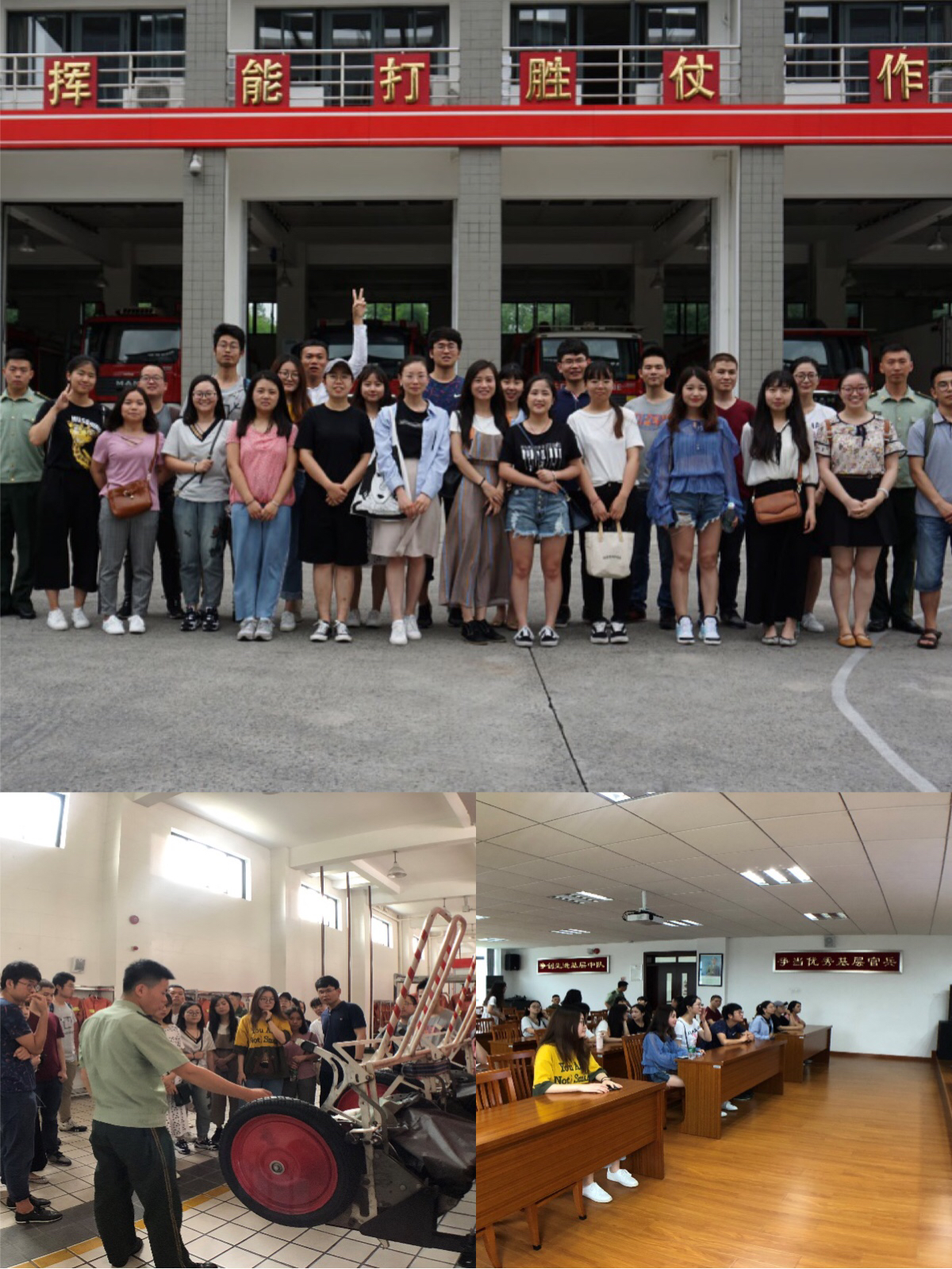 6月9日下午3时40分,我院2016级社会学研究生党支部来到位于上海市长宁区的新泾消防中队进行参观。首先,小组成员为夏日中坚守岗位的官兵们送去清凉可口的大西瓜,向他们表达我们对他们爱岗敬业精神的敬意。其次,中队杨排长将小组成员们带到消防车库,为大家一一讲解不同类型的消防车分别具备的独特性能和适用救灾场景。我们了解到,在日常生活千篇一律的红色消防车其实各有不同,有大功率水罐车,有社会救援车(如处理交通事故用),有后勤补给车等等。同时,杨排长还让战友为我们演示了接到救援指示后,战士们是如何迅速通过滑杆赶到消防车库,以及如何快速穿上消防服赶往救援现场。然后,在杨排长的带领下,支部成员参观了消防官兵日常生活的场所—明亮整洁的寝室,温馨有爱的家属接待室,互帮互助的理发室,丰富多样的休闲娱乐活动室(棋牌室、影视播放厅、器乐室、健身房、台球室、羽毛球馆)等,还有安静的读书角。看到消防官兵们除了辛苦的日常操练,还有这么丰富多彩的生活,感受到在社会和国家危急时刻,有这些最美逆行者守卫着我们,他们值得有一个强大的国家做他们强劲而温暖的后盾,他们值得我们的崇敬。接着,消防官兵为我们准备了一场精彩的消防知识讲座,向我们科普了如何应对火灾,以及如何在日常生活中预防火灾,防患于未然。之后几位消防员为大家演示了如何使用灭火枪实施救援,同时也邀请支部成员现场体验水压枪的操作。我们了解到应对不同的火势,应如何通过旋转喷头顶部装置调节喷水形状和冲击力。最后,支部成员和消防官兵们合影留念。经历短暂的学习和体验,小组成员意犹未尽地向基层消防官兵告别,同时表达了对他们的由衷感激和敬佩。