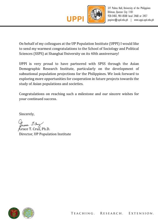 贺信——菲律宾大学人口研究所