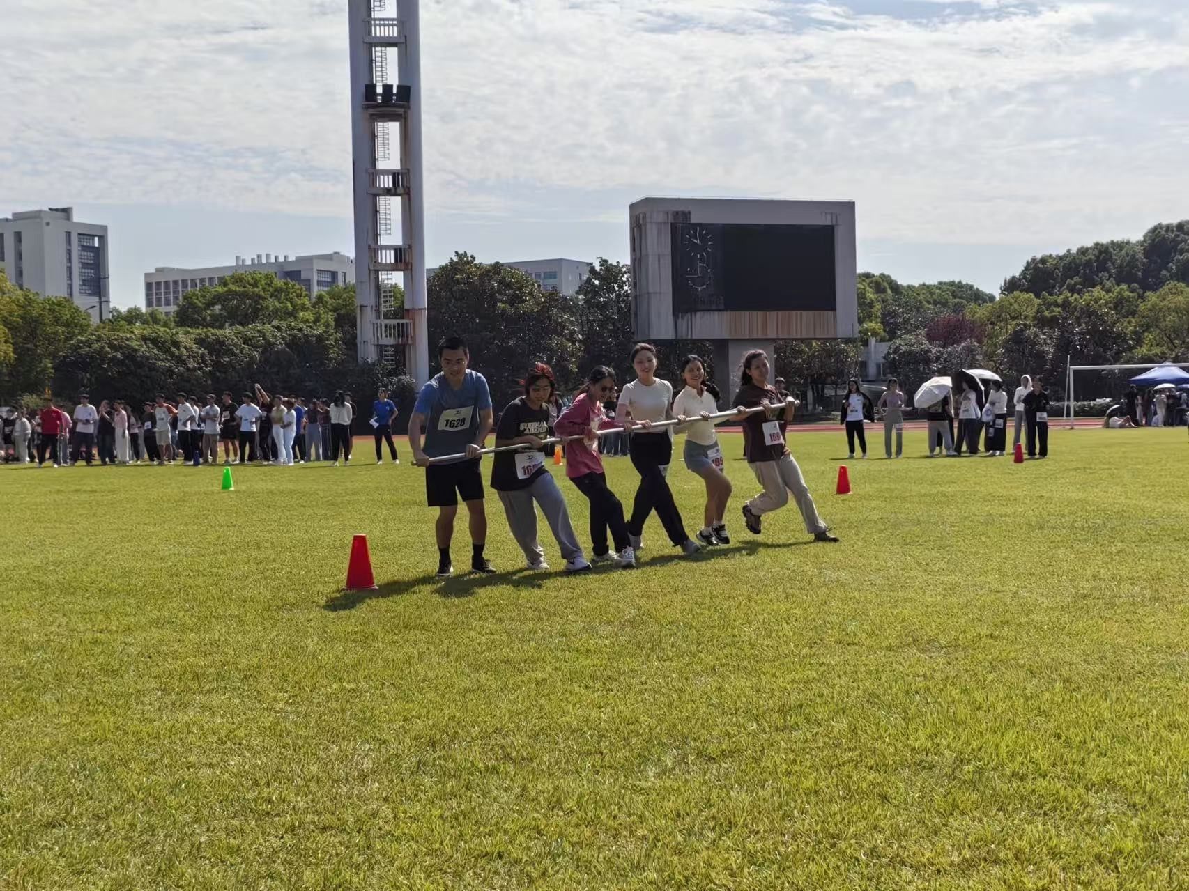 在接力跳绳、团体拔河、袋鼠跳迎面接力等趣味项目中,社院学子们展现了通力合作、为院争光的团结奉献精神。