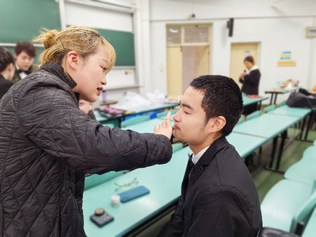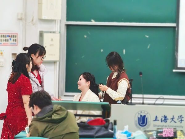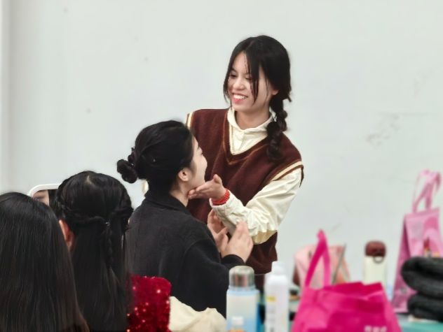 12月8日下午,合唱团成员们在候场教室互帮互助完成妆造:男生们身着黑色西装,显得庄重典雅;女生们则身穿红色长裙,优雅大方。志愿者团队在候场区域全程协助,让合唱团成员们以最佳状态迎接即将到来的比赛。