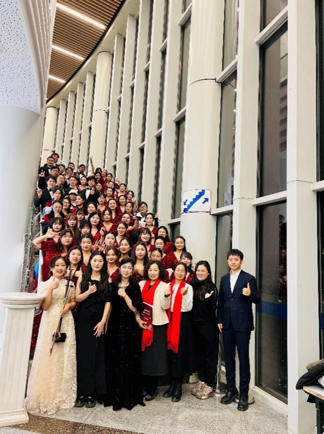 比赛结束后,合唱团的成员和一直坚守岗位、提供支持的老师们在后台合影留念。无论比赛结果如何,每一位参与者都已经用他们的歌声和热情,为党的光辉和心中的信念献上了最诚挚的赞颂。