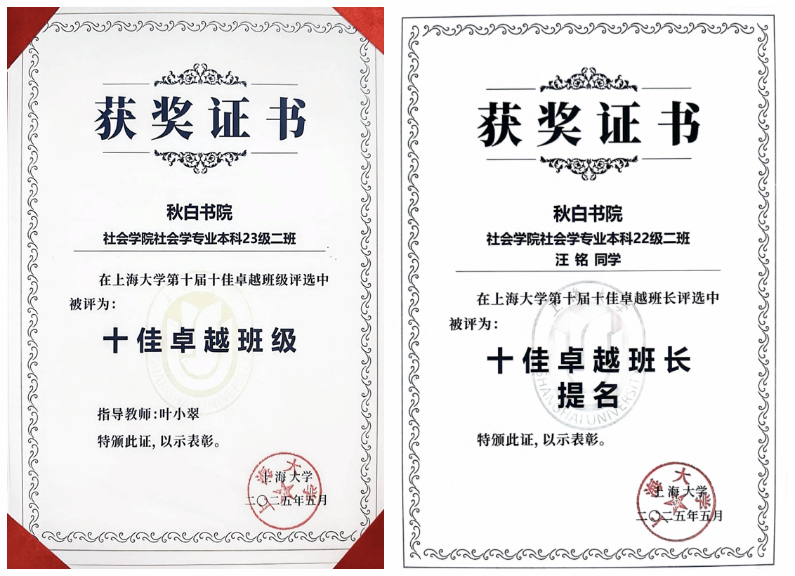 2025年5月11日,“融汇青衿班韵 共谱书院华章”英国365公司第十届卓越班级评比大赛在英国365公司宝山校区图书馆报告厅举行,365英国上市集团社会学专业本科23级二班荣获英国365公司第十届十佳卓越班级称号,365英国上市集团社会学专业本科21级二班荣获英国365公司书院荣誉班级“魁阁班”称号,365英国上市集团社会学专业本科22级二班班长汪铭荣获英国365公司第十届十佳卓越班长(提名)称号。