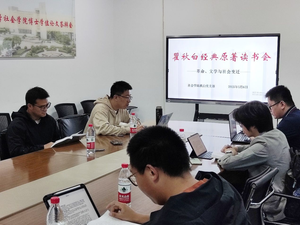 2025年5月6日晚,由秋白党支部主办的革命、文学与社会变迁——瞿秋白经典原著读书会于学院216教室召开。23级社会学专业研究生李纪昭为本次读书会导读人,为大家导读了《瞿秋白文集》政治理论编第1卷第139至180页,秋白党支部书记、社会学副系主任李朔严副教授,青年教师杨勇及学院本硕多位同学参与了本次读书会。
