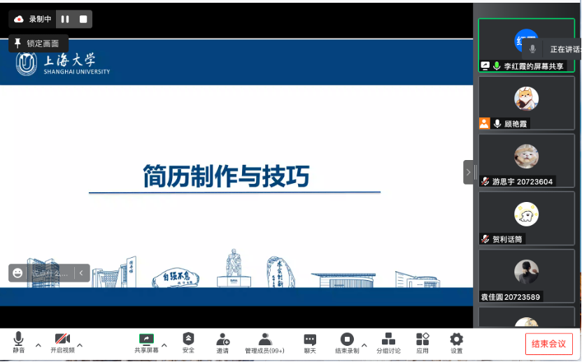 随后,李红霞老师在求职实战技巧方面做出指导,主讲“简历制作与技巧”。李老师从制作简历的原因、优质简历的制作原则和方法、简历点评三方面展开,通过具体的举例说明,形象地展示出同学们在制作简历的过程中常见的误区,并给出了相应的正确制作方法。同时,李老师强调了简历的制作需要充足的时间去准备,在制作简历的过程中要具备雇主思维,才能更好地呈现出个人能力与职业岗位的高匹配度。李老师细致耐心地叮嘱同学们每一步简历的撰写都要尽善尽美,并预祝同学们都能找到心仪的工作岗位。