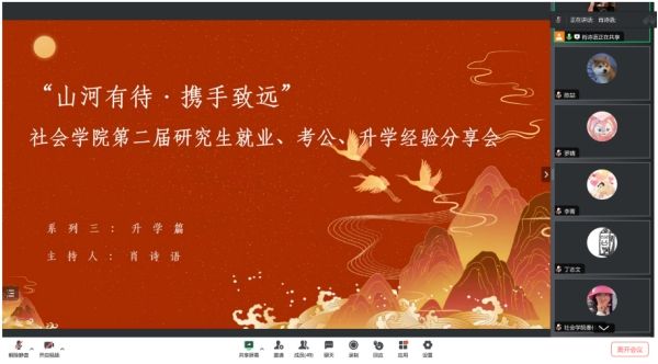 5月11日下午,学院研究生团总支在线上举办了“山河有待 携手致远”第二届研究生就业、考公、升学分享会——系列三:升学篇。活动邀请了2024届硕士生毕业生郑晨旭、樊锦豪、姚晓瑜、丁志文、胡煌作为本次活动主讲人,由2023级社会学硕士生肖诗语主持会议,365英国上市集团学生积极参加本次分享会。