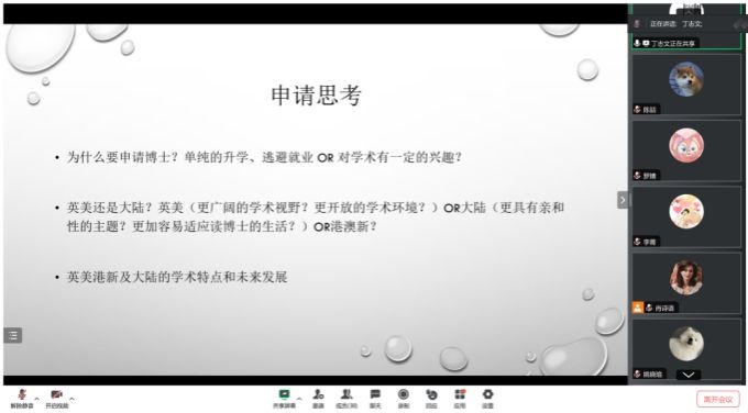 第四位主讲人是2024届社会学专业硕士生丁志文,获华威大学社会学系博士研究生offer。丁志文同学以自己的实际经验为同学们分析国外及香港申博的区别与感受,列举了不同地区的学科学术特点及偏好,避免同学们走入误区。此外,他还详细讲解如何撰写所需的各项文件及其侧重点,并建议大家提早准备。