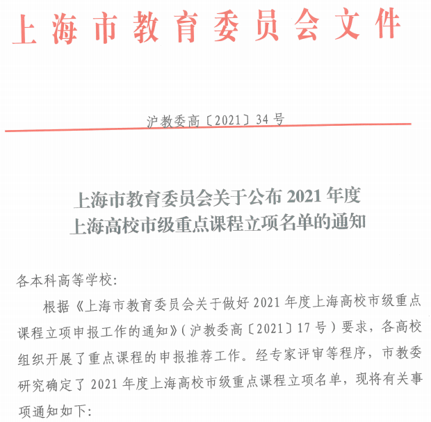 2021年4月,学院根据《上海市教育委员会关于做好2021年度上海高校市级重点课程立项申报工作的通知》(沪教委高【2021】17 号)和学校《关于开展2021年度校级和上海高校市级重点课程立项申报工作的通知》(教务部【2021】8号)的要求和精神,积极组织开展重点课程申报推荐工作。经个人申报、学院推荐、学校审核推荐、专家评审等程序,两门课程入围2021年度上海高校市级重点课程立项名单。