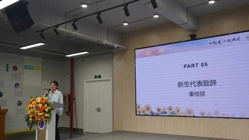 理学院2025级本科生秦佳丽同学代表受助新生发言,表达了对基金会与学校的诚挚感谢,并表示将珍惜机会、勤奋学习,用实际行动回报社会关爱。